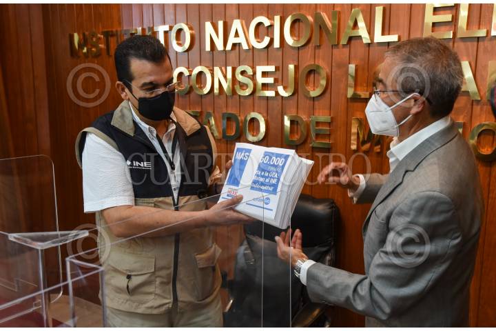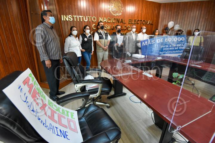 Integrantes de Misión Rescate México acudieron a la Junta Local del INE a respaldar la labor de este órgano electoral.
