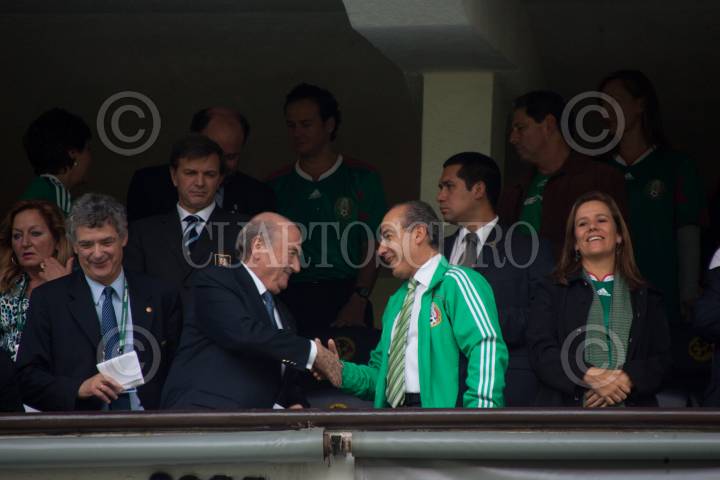 MÉXICO, D.F., 10JULIO2011.- Joseph Blatter, presidente de la FIFA, Felipe Calderón Hinojosa, Presidente de los Estados Unidos Mexicanos, y su esposa Margarita Zavala, previo al juego entre la selección mexicana, la cual ganó 2-0 a su similar uruguaya, en el Estado Azteca. FOTO: DEMIÁN CHÁVEZ/CUARTOSCURO.COM