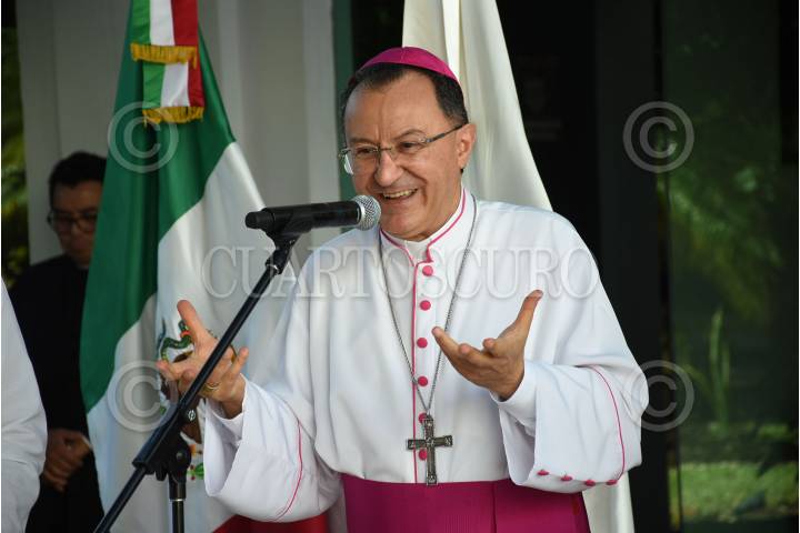 CAMPECHE, CAMPECHE, 01DICIEMBRE2023.- En su visita a Campeche nuncio apostólico en México Joseph Spiteri ofreció una conferencia de prensa en compañía del secretario de gobierno del estado Armando Toledo Jamit y del Obispo de Campeche José Francisco González, durante su mensaje llamo al nunca olvidarse del dialogo respetando las diferencias, pues eso ayuda para un bien común y al crecimiento. FOTO: MICHAEL BALAM/CUARTOSCURO.COM