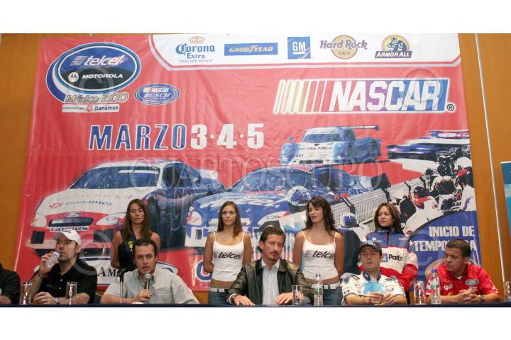 MEXICO, D.F., 12ENERO2006.- Los pilotos Carlos Contreras, Michael Jourdain Jr., Federico Lavan, Luis Chapulín Díaz y José Luis Ramirez, durante la presentación del serial México 2000 de Nascar que se correrá en el Autodromo Hermanos Rodríguez. FOTO: Moisés Pablo/CUARTOSCURO.COM