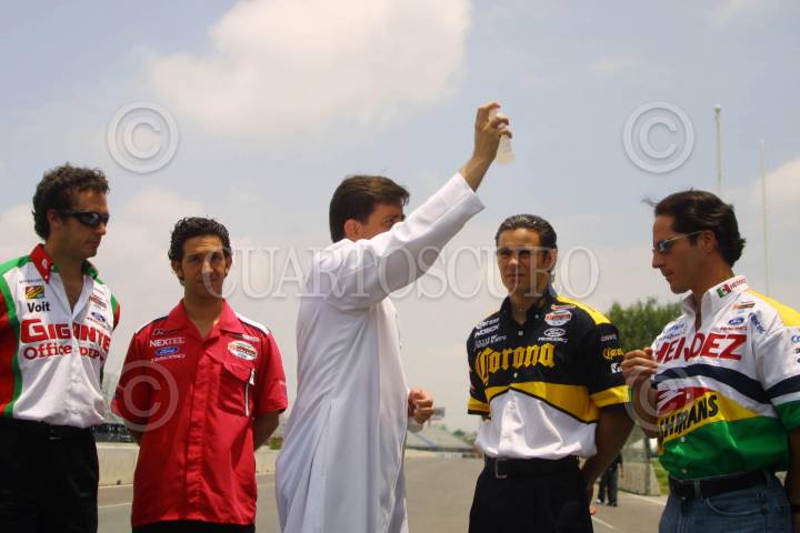 Monterrey, N.L. 19 de mayo de 2004 Los pilotos mexicanos Michel Jourdain, Roberto Gonzalez, Mario Domínguez y Rodolfo Lavin, reciben la bendición de parte del padre Marcelo Varela, previo a la competencia de este fin de semana. FOTO: Jorge López/CUARTOSCURO.COM