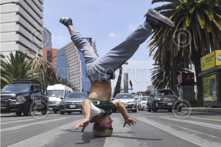 CIUDAD DE MÉXICO, 24MAYO2025.- Un joven realiza una rutina de breakdance para ganarse unas monedas en el cruce de la avenida Juárez y la calle José Azueta. FOTO: MARIO JASSO/CUARTOSCURO.COM