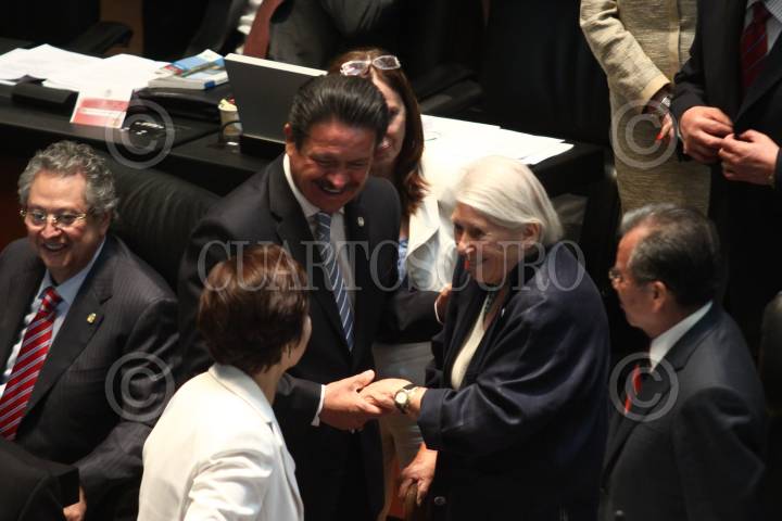 MÉXICO, D.F., 27ABRIL2011.- El senador del PRD, Carlos Navarrete saluda a Joy Laville, viuda de Jorge Ibargüengoitia durante una visita que realizo al Senado de la República. FOTO: RODOLFO ANGULO/CUARTOSCURO.COM