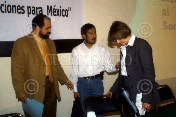 Emilio Alvarez Icaza, presidente de la Comisión de Derechos Humanos del D. F., Edgar Cortez y Joy Olson, directora de la Oficina en Washington para Asuntos Latinoamericanos se saludan a su llega al Seminario de "Seguridad Pública y Derechos Humanos: Perspectivas Internacionales, lecciones para México". FOTO: Nelly Salas/CUARTOSCURO.COM