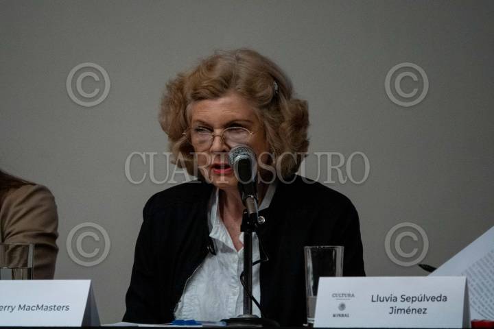 CIUDAD DE MÉXICO, 08SEPTIEMBRE2023.- La periodista Merry MacMasters durante su participación en la mesa con motivo del homenaje a 100 años del natalicio de Joy Laville en la Sala Manuel M. Ponce del Palacio de Bellas Artes FOTO: GALO CAÑAS/CUARTOSCURO.COM