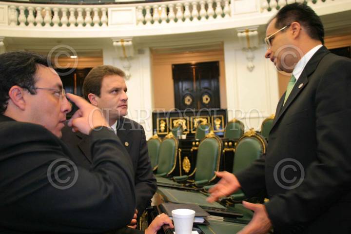 Los panistas Juan Antonio Arevalo y José Espina, charlan con el líder del PRD en la Asamblea, René Bejarano, durante la sesión de ese organo legslativo. FOTO: Juan Pablo Zamora/CUARTOSCURO.COM