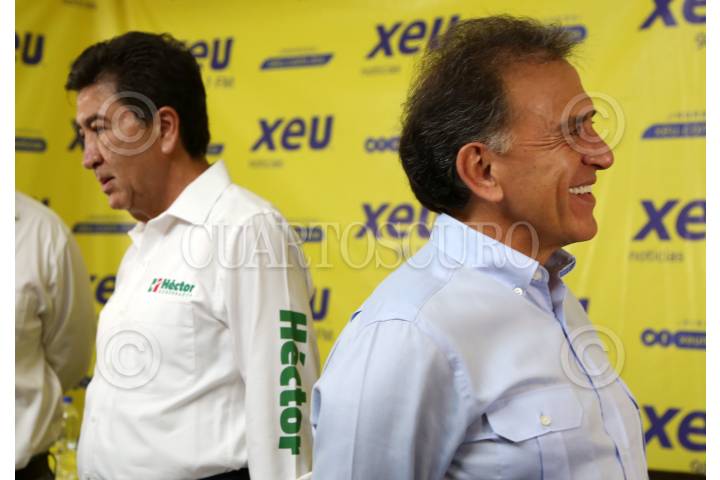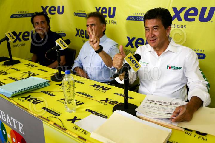VERACRUZ, VERACRUZ, 27ABRIL2016.- En las instalaciones de una popular radiodifusora veracruzana se realizó el debate de candidatos a la gubernatura del estado. El formato del debate incluyó réplica y contra réplica, los temas expuestos fueron: Seguridad; Desarrollo Económico y Tema Libre. A pesar de que los organizadores prohibieron la asistencia a simpatizantes de los partidos, éstos se mantuvieron a las afueras del recinto sin presentarse violencia como en años anteriores. En la imagen Miguel Ángel Yunes Linares, candidato de la alianza PAN-PRD, a su espalda Héctor Yunes Landa, candidato del PRI. FOTO: ILSE HUESCA /CUARTOSCURO.COM