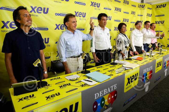 VERACRUZ, VERACRUZ, 27ABRIL2016.- En las instalaciones de una popular radiodifusora veracruzana se realizó el debate de candidatos a la gubernatura del estado. El formato del debate incluyó réplica y contra réplica, los temas expuestos fueron: Seguridad; Desarrollo Económico y Tema Libre. A pesar de que los organizadores prohibieron la asistencia a simpatizantes de los partidos, éstos se mantuvieron a las afueras del recinto sin presentarse violencia como en años anteriores. En la imagen los candidatos: Miguel Ángel Yunes Linares; Hécor Yunes Landa; Alba Leonila Méndez Herrera; Armando Méndez de la Luz; Víctor Alejandro Vázquez Cuevas y Juan Bueno Torio. FOTO: ILSE HUESCA /CUARTOSCURO.COM