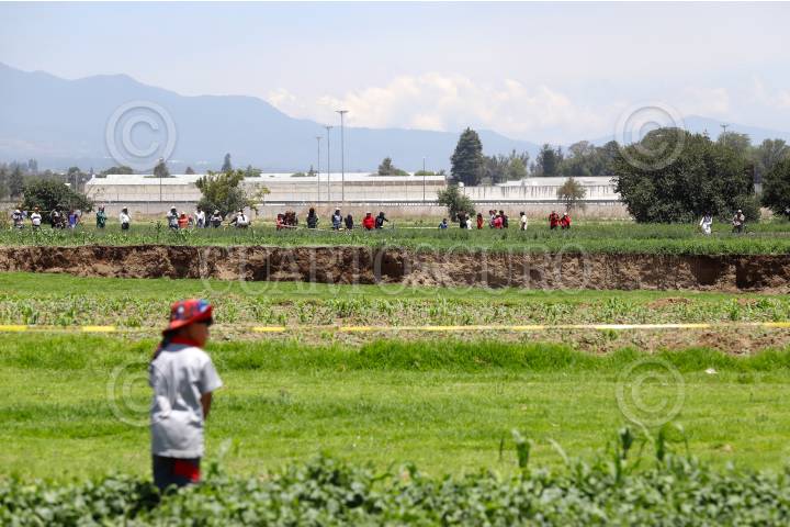 Socavón registrado en una zona cultivos de la comunidad de Santa María Zacatepec el cual ha incrementado su tamaño aproximadamente a 80 metros de diámetro y 20 metros de profundidad.