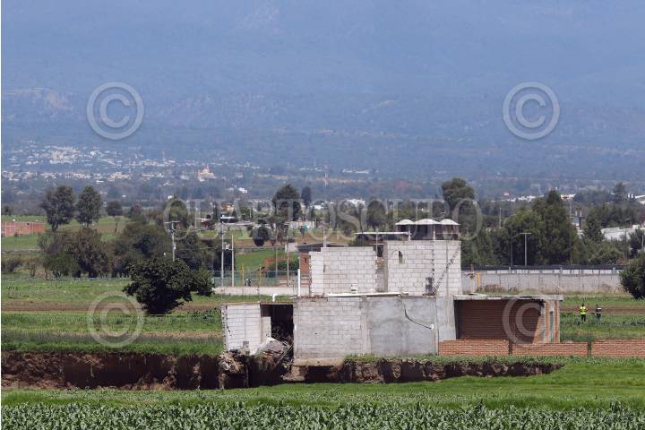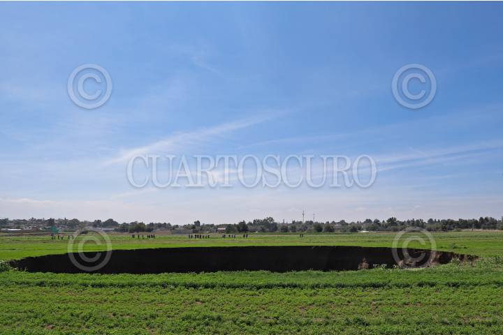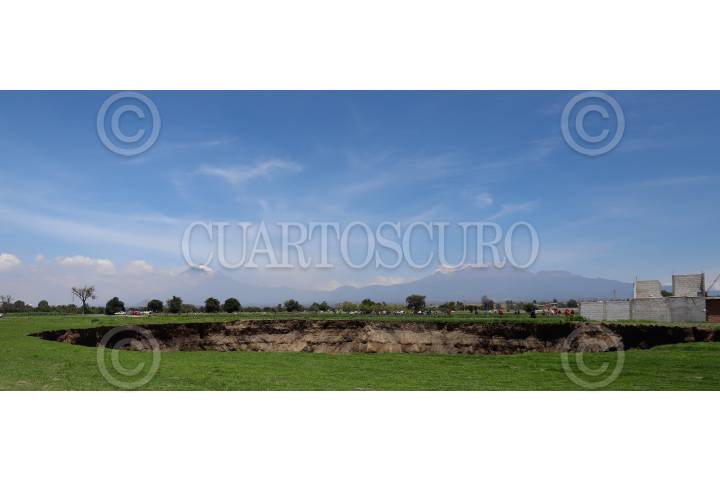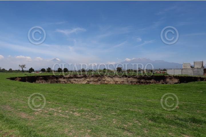 Un enorme socavón apareció en una tierra de cultivo en Santa María Zacatepec, Puebla, esta enorme oquedad mide actualmente 60 metro de diámetro y continúa creciendo.