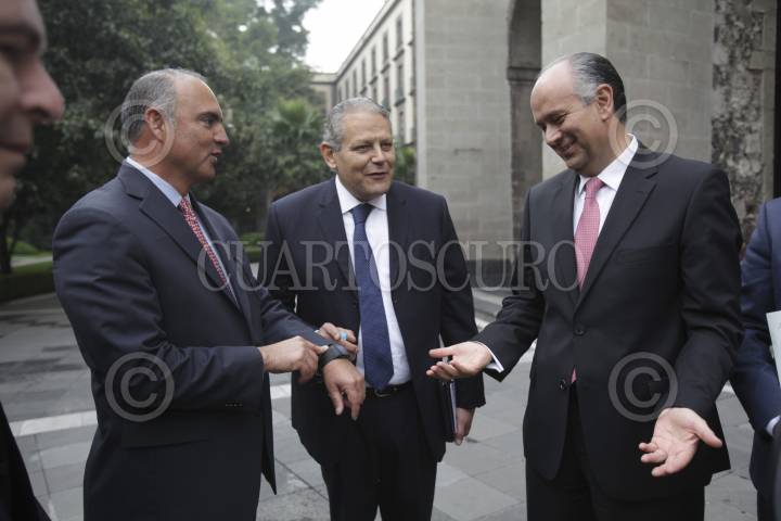 MÉXICO, D.F., 28OCTUBRE2015.- José Calzada Rovirosa, titular de la Sagarpa; Fernando Aportela, subsecretario de Hacienda y Crédito Público; y Juan Carlos Cortés García, director Financiera Nacional de Desarrollo Agropecuario Rural, Forestal y Pesquero; al finalizar la ceremonia en donde firmaron un convenio de colaboración, en el Palacio Nacional. FOTO: ANDRÉS YAÑEZ /CUARTOSCURO.COM
