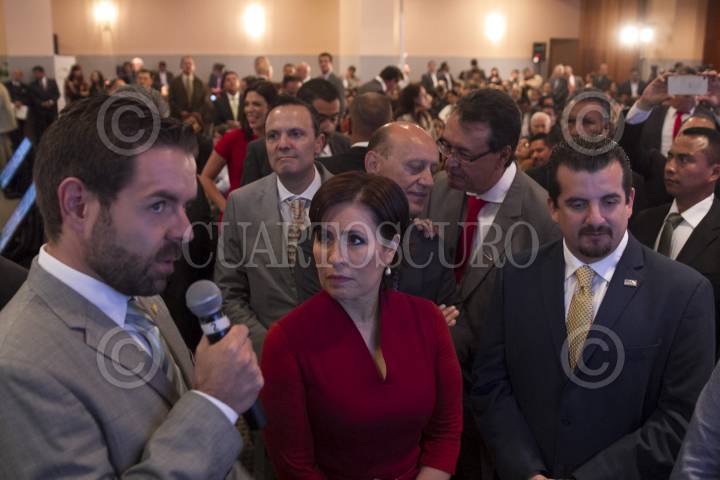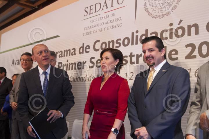 CIUDAD DE MÉXICO, 12JULIO2016.- Juan Carlos Lastiri Quirós, subsecretario de Desarrollo Urbano y Vivienda; Rosario Robles Berlanga, secretaria de Desarrollo Agrario, Territorial y Urbano (Sedatu), y Carlos Medina Rodríguez, presidente de Canadevi, durante la presentación "Avances del programa de consolidación de reservas urbanas primer semestre de 2016". FOTO: MOISÉS PABLO /CUARTOSCURO.COM