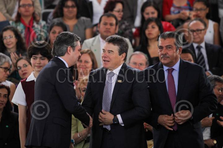 CIUDAD DE MÉXICO, 06JULIO2017.- Juan Díaz de la Torre, secretario general del Sindicato Nacional de Trabajadores de la Educación; Luis Enrique Miranda Nava, secretario de Desarrollo Social, y Aurelio Nuño Mayer, Secretario de Educación Pública (SEP), en la presentación de la Estrategia de Equidad e Inclusión dentro del Nuevo Modelo Educativo, en el edificio de la SEP. FOTO: MOISÉS PABLO /CUARTOSCURO.COM
