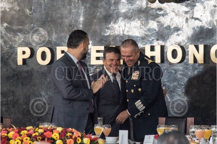 CIUDAD DE MÉXICO, 18MAYO2018.- Salvador Cienfuegos Zepeda, secretario de la Defensa Nacional; Israel Joab Sifri Cortes, representante de Educación Pública y Juan Díaz de la Torre, presidente del Consejo General del Sindicato Nacional de Trabajadores de la Educación (SNTE), encabezaron la celebración con motivo del día del maestro en las instalaciones del Heroico Colegio Militar en Tlalpan. FOTO: MARIO JASSO /CUARTOSCURO.COM