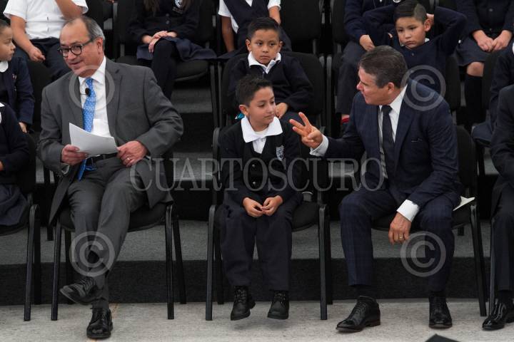CIUDAD DE MÉXICO, 20AGOSTO2018.- Otto Granados Roldán, secretario de Seguridad Pública, y Juan Díaz de la Torre, secretario general del Sindicato Nacional de Trabajadores de la Educación, durante la ceremonia de inicio del ciclo escolar 2018-2019 en la Escuela Primaria "Benito Juárez", en la colonia Roma. FOTO: MOISÉS PABLO /CUARTOSCURO.COM