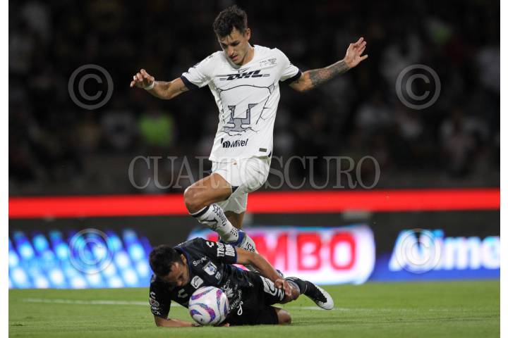 CIUDAD DE MÉXICO, 04AGOSTO2023. Juan Dinenno disputa un balón a Omar Mendoza de Gallos Blancos quien comete una mano en él aérea y sería expulsado al minuto 39 durante el partido de fútbol Pumas vs Querétaro correspondiente a la jornada 11 del Torneo Apertura 2023 de Liga BBVA MX, en el Estadio Olímpico Universitario. FOTO: EDGAR NEGRETE/CUARTOSCURO.COM