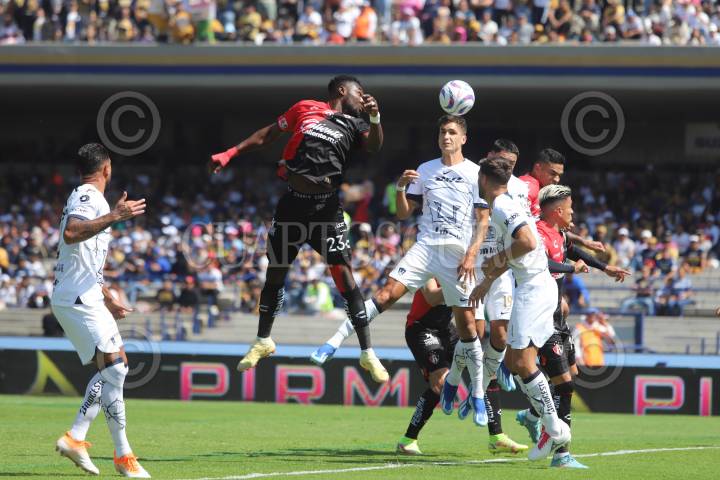 CIUDAD DE MÉXICO, 05NOVIEMBRE2023. Juan Dinenno de Pumas remata una pelota en un tiro de esquina durante el partido de fútbol Pumas vs Atlas correspondiente a la jornada 11 del Torneo Apertura 2023 de Liga BBVA MX, en el Estadio Olímpico Universitario. FOTO: EDGAR NEGRETE/CUARTOSCURO.COM