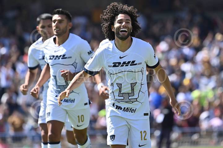 CIUDAD DE MÉXICO, 04AGOSTO2023.Juan Dinenno festeja una anotación de Pumas en partido de fútbol Pumas vs Querétaro correspondiente a la jornada 11 del Torneo Apertura 2023 de Liga BBVA MX, en el Estadio Olímpico Universitario. Dónde los Universitarios se quedaron con la victoria con marcador de 4 a 0. FOTO: EDGAR NEGRETE/CUARTOSCURO.COM