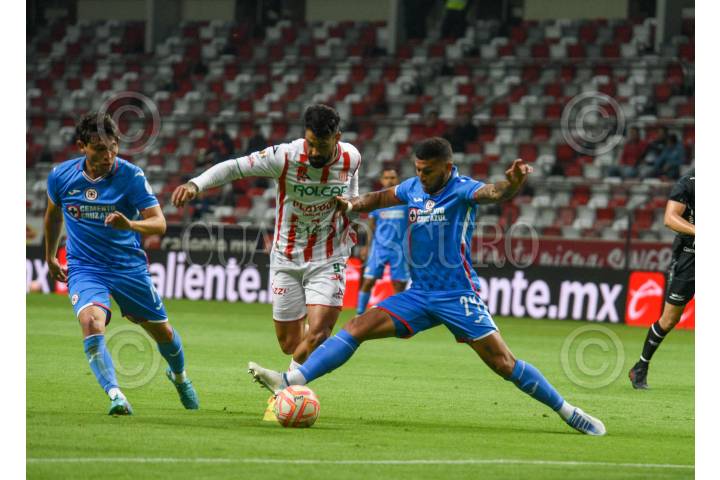 Milton Giménez delantero de Necaxa y Juan Escobar defensa de Cruz Azul en la Copa Sky en el estadio Nemesio Diez.