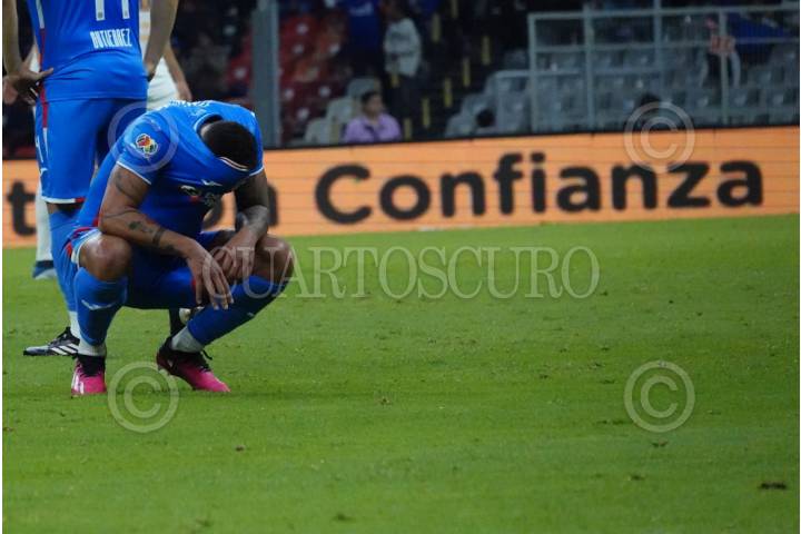 Juan Escobar, lateral derecho del equipo del Cruz Azul, cubrió su rostro con la playera al finalizar el partido contra los Tigres durante la Jornada 5 de Clausura 2023 en el Estadio Azteca