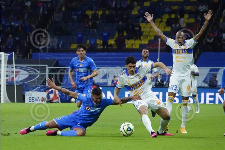 Los jugadores Juan Escobar (Cruz Azul) y Nicolás Alejandro Ibáñez (Tigres) disputaron el balón durante el partido de la Jornada 5 de la Clausura 2023 en el Estadio Azteca
