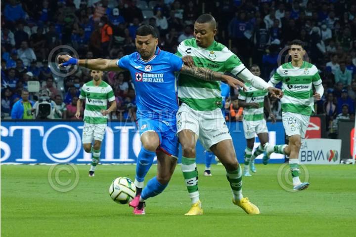 Juan Escobar, lateral derecho del Cruz Azul, y Ayrton Preciado, delantero del equipo del Santos disputan el balón en el Estadio Azteca