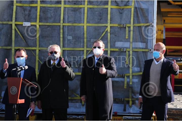 El secretario de Hacienda, Arturo Herrera, el titular de Salud, Jorge Alcocer, el Canciller Marcelo Ebrard y el titular del Insabi, Juan Ferrer, recibieron en el aeropuerto el nuevo cargamento de Vacunas elaboradas por Pfizer para combatir el Covid-19.