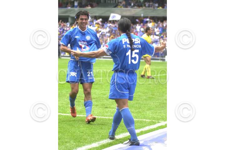Juan Carlos Cacho festeja con Francisco Palencia el tercer gol de Cruz Azul, quien venció 3-1 al América en el llamado "clásico jóven" en el estadio Azteca. FOTO: Juan Pablo Zamora/CUARTOSCURO.COM