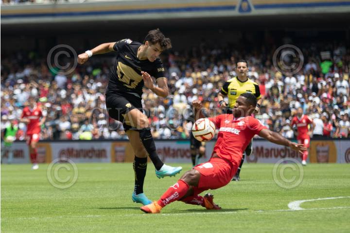 Juan Ignacio Dinenno, delantero de los Pumas, remata de cabeza para anotar el primer gol de su equipo ante el Toluca.