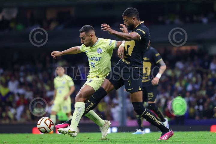Juan Ignacio Dinenno de los Pumas, durante el encuentro contra el América, que empataron a un gol, en el Estadio Azteca.