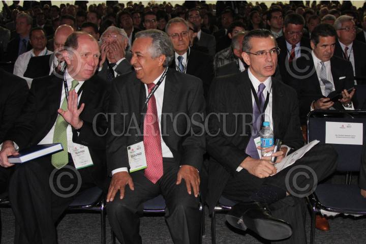 MÉXICO, D.F., 30JULIO2012.- Carlos Morales Gil, director general de PEMEX exploración y producción, Ricardo Bego-Ghina Martínez. subgerente de servicios jurídicos de PEMEX refinación y Juan Jose Suarez Coppel, director general del PEMEX, durante la ExpoForo PEMEX, realizado en el Centro Banamex. FOTO: SAÚL LÓPEZ /CUARTOSCURO.COM