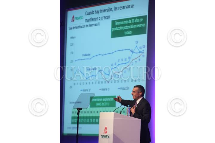 MÉXICO, D.F., 30JULIO2012.- Juan José Suárez Coppel, director general del PEMEX, durante su ponencia en la ExpoForo PEMEX, realizado en el Centro Banamex. FOTO: SAÚL LÓPEZ /CUARTOSCURO.COM