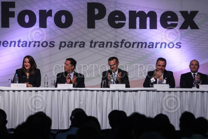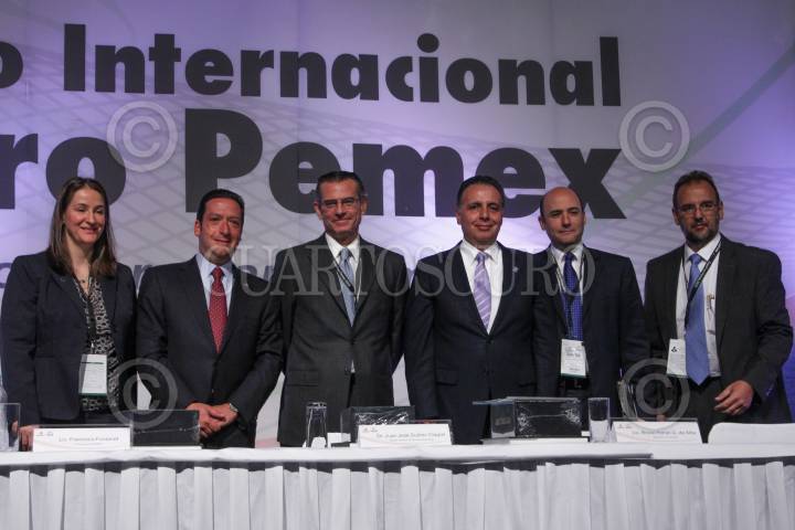 MÉXICO, D.F., 01AGOSTO2012.- Cybele Díaz Wionczek, Subdirectora de la Unidad de Desarrollo de Proveedores, Contratistas y Contenido Nacional de PEMEX junto a Francisco Funtanet, Presidente de la CONCAMIN; Juan José Suárez Coppel, Director General de Petroleos Mexicanos (PEMX); Bruno Ferrari, Secretario de Economia y Carlos R. Murrieta Cummings, Director Coorporativo de Operaciones de PEMEX durante el primer foro internacional ExpoForo Pemex que tuvo lugar en el Centro Banamex. FOTO: ENRIQUE ORDÓÑEZ /CUARTOSCURO.COM