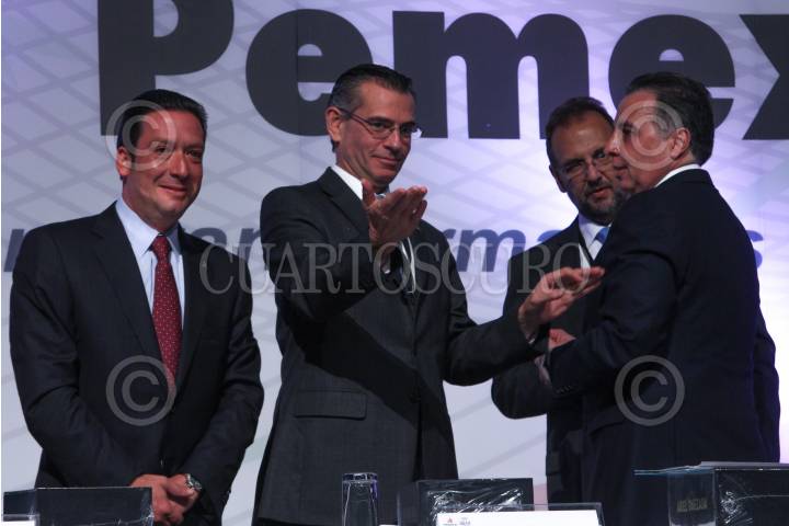 MÉXICO, D.F., 01AGOSTO2012.- Francisco Funtanet, Presidente de la CONCAMIN junto a Juan José Suárez Coppel, Director General de Petroleos Mexicanos (PEMEX); Bruno Ferrari, Secretario de Economía y Carlos R. Murrieta Cummings, Director Coorporativo de Operaciones de PEMEX durante el primer foro internacional ExpoForo Pemex que tuvo lugar en el Centro Banamex. FOTO: ENRIQUE ORDÓÑEZ /CUARTOSCURO.COM