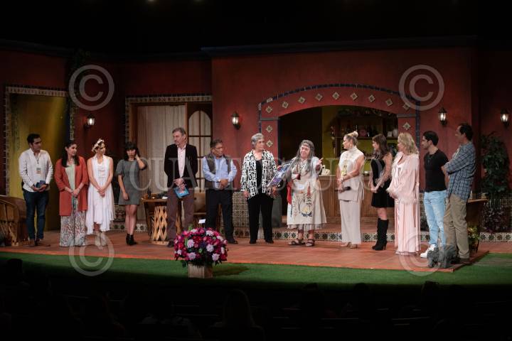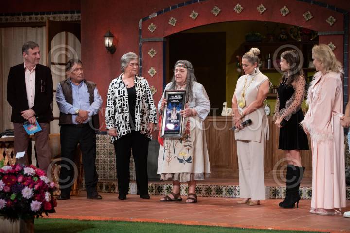Angelina Moreno, Juan Osorio, Angelina Moreno, Leticia Calderon y Eva Daniela durante el homenaje a la actriz Beatriz Moreno por sus 50 años de trayectoria, dentro de la obra Los Guajolotes Salvajes en el Teatro Ignacio López Tarso.
