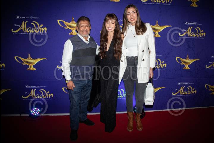 Juan Osorio y Eva Daniela durante la alfombra roja por las 450 representaciones del musical Aladdín, que se presenta en el Teatro Telcel.