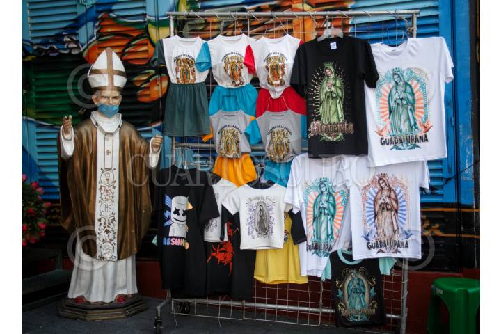 El ex papa fallecido Juan Pablo II acompaña la mercancía de la Virgen de Guadalupe que se vende en las inmediaciones de la Basílica.