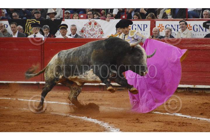 CIUDAD DE MÉXICO, 22ENERO2017.- El matador mexicano Juan Pablo Sánchez lidia a su primer toro de la tarde "Venadito", en la undécima corrida de la temporada grande de la Monumental Plaza México. FOTO: GABINO ACEVEDO /CUARTOSCURO.COM