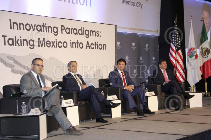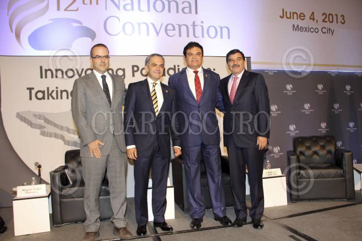 MÉXICO, D.F., 04JUNIO2013.- Juan Pardinas, moderador, Miguel Ángel Mancera, Jefe de Gobierno, Mario López Valdez, gobernador de Sinaloa, y Mariano González Zarur, gobernador de Tlaaxala, participaron en la convención anual de American Chamber, en un hotel de la capital. FOTO: CUARTOSCURO.COM
