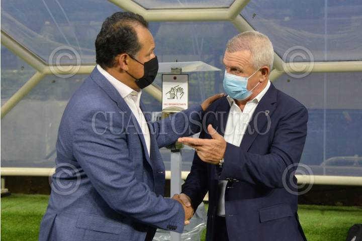 Los directivos técnicos: Juan Reynoso (Cruz Azul) y Javier Aguirre (Monterrey) se saludan previo al arranque del partido de repechaje del la Liga MX Apertura 2021.