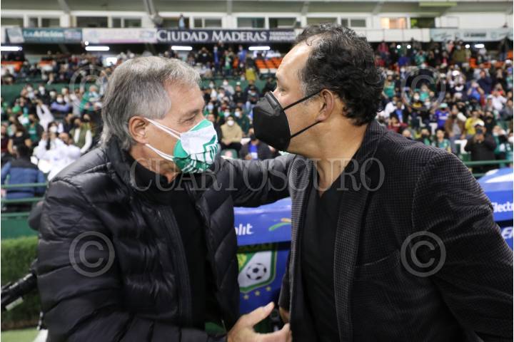Ariel Holan, director técnico del León, saluda a Juan Reynoso, técnico del Cruz Azul, previo al encuentro en el Estadio León.