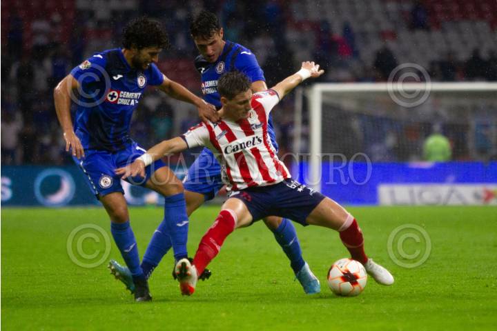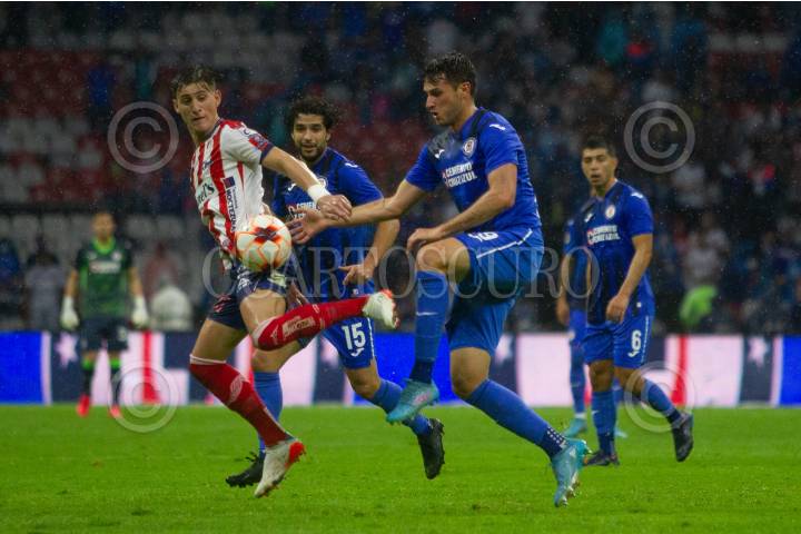 José Rivero y Santiago Giménez de Cruz Azul disputan un balón con Facundo Waller del Atlético San Luis durante el partido de fútbol correspondiente a la jornada 16 del torneo Clausura 2022 “Grita por la inclusión” de la Liga MX entre Cruz Azul vs Atlético San Luis en el Estadio Azteca.