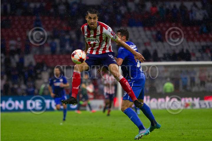 Christian Tabó de cruz Azul remata de cabeza durante el partido de fútbol correspondiente a la jornada 16 del torneo Clausura 2022 “Grita por la inclusión” de la Liga MX entre Cruz Azul vs Atlético San Luis en el Estadio Azteca.