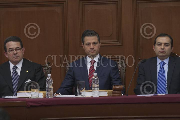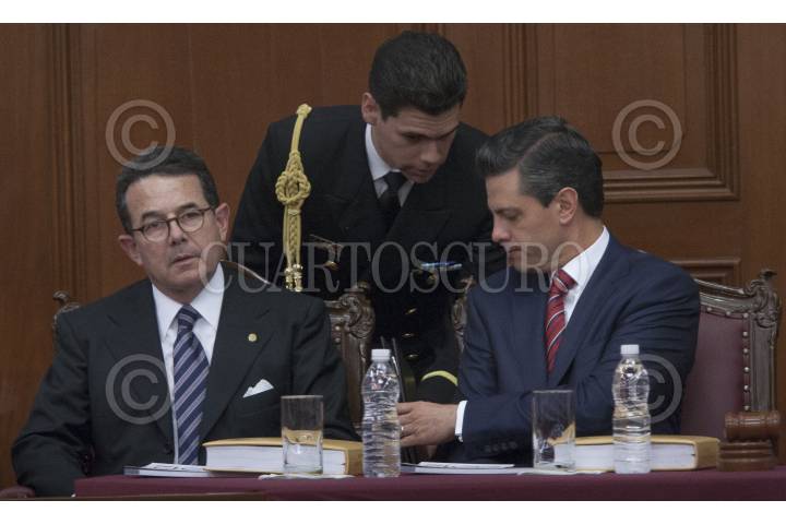 MÉXICO, D.F., 13DICIEMBRE2012.-Francisco Arroyo Vieyra, presidente de la mesa directiva de la Cámara Baja, flanquea Enrique Peña Nieto durante el 2o Informe del Magistrado Juan Silva Meza, como magistrado presidente de la Suprema Corte de Justicia de la Nación. FOTO: JUAN PABLO ZAMORA /CUARTOSCURO.COM