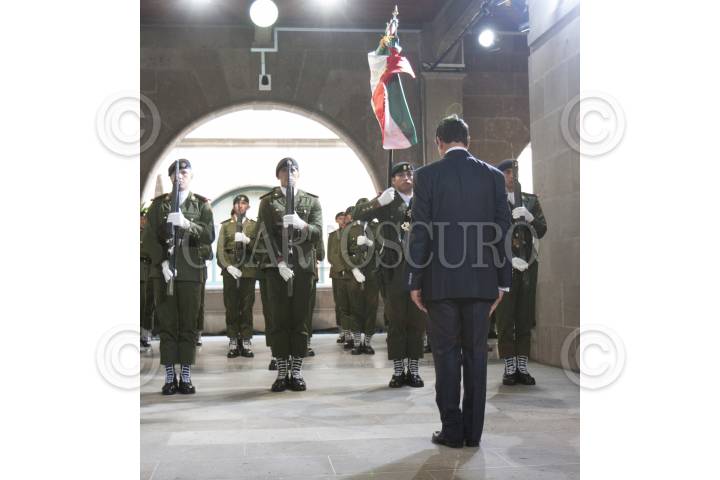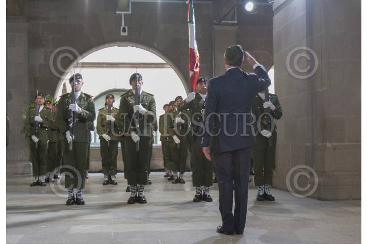 MÉXICO, D.F., 09FEBRERO2013.- Juan Silva Meza, Ministro Presidente de la Suprema Corte de Justicia de la Nación (SCJN), Enrique Peña Nieto, Presidente de la República, Salvador Cienfuegos, Secretario de la Defensa Nacional; Vidal Soberón, Secretario de Marina y Armada de México y Ernesto Cordero Arroyo, Presidente del Senado de la República, hacen honores a la Bandera durante el C Aniversario de la Marcha de la Lealtad llevado acabo en el Castillo de Chapultepec. FOTO: MISAEL VALTIERRA / CUARTOSCURO.COM