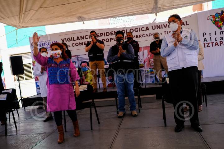La alcaldesa de Iztapalapa, Clara Brugada, acudió a las instalaciones del mercado Juan de la Barrera, en donde se llevo a cabo, en conjunto con locatarios, la apertura del programa “Vigilancia Epidemiológica Universal en el Comercio Popular”.