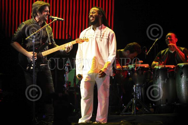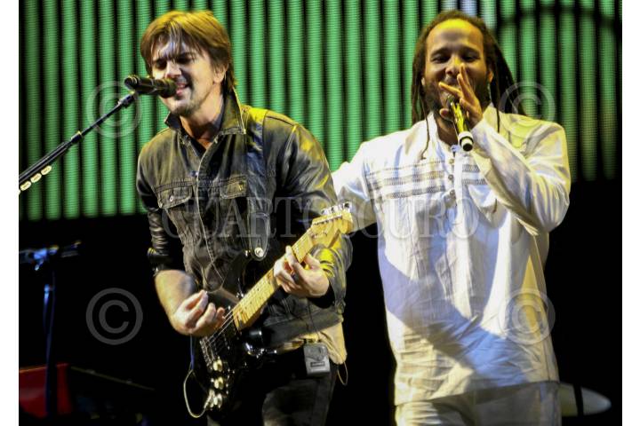 PAPANTLA, VERACRUZ, 22MARZO2013.- El cantautor colombiano, Juanes, compartió escenario con el cantante jamaiquino, Ziggy Marley, durante su presentación en el parque Takilhsukut dentro del marco de actividades y conciertos de Cumbre Tajín 2013. FOTO: FÉLIX MÁRQUEZ /CUARTOSCURO.COM