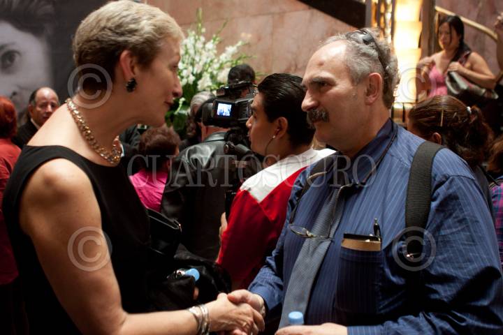 MÉXICO, D.F., 28MAYO2011.- La embajadora inglesa Judith MAcGregor, saludó a Pablo Weisz Carrington, al finalizar el homenaje a la artista plástica Leonora Carrington, quien falleció el pasado miércoles a la edad de 94 años, en el Palacio de Bellas Artes. FOTO: MOISÉS PABLO/CUARTOSCURO.COM