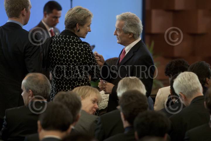MÉXICO, D.F., 13DICIEMBRE2011.- Los embajadores Judith Macgregor, Reino Unido y Daniel Parfait, Francia, durante la clausura del seminario del G-20 "Desafíos Actuales para el Crecimiento Económico Global", que contó con la presencia, Felipe Calderón Hinojosa Presidente de México, y que se celebró en las instalaciones de la Secretaría de Relaciones Exteriores. FOTO: MOISÉS PABLO/CUARTOSCURO.COM