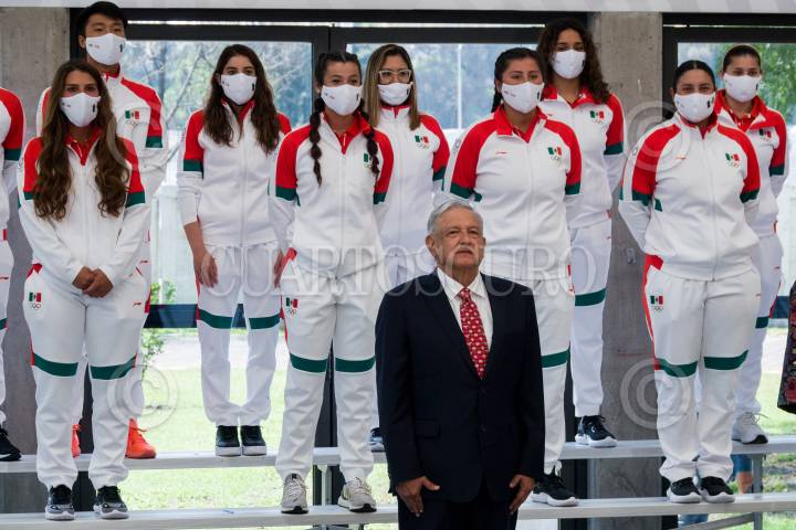 Claudia Sheinbaum; Delfina Gómez; Andrés Manuel López Obrador; Ana Gabriela Guevara, y Carlos Padilla durante el abanderamiento a la federación mexicana que participará en los Juegos Olímpicos 202 en Tokyo, Japón.